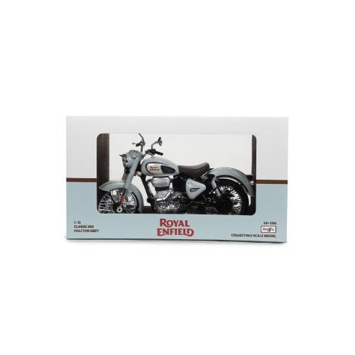 The Maisto Royal Enfield Classic 350 Halcyon Grey 1:12 scale model is a finely detailed die-cast replica that captures the vintage soul of the new-generation Classic 350 in its Halcyon Grey avatar. This collectible scale model reflects Royal Enfield’s legendary craftsmanship, combining heritage styling with modern engineering.